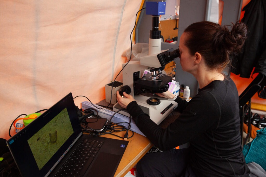 After Georgia has marked, described and cut the cores into one metre sections, they’ll be passed to Martin, working in a small lab housed in a container on the ice. . There, he’ll prepare microscope slides from samples of different core layers and set the AI system to work on the huge task of cataloguing and counting the microfossils.